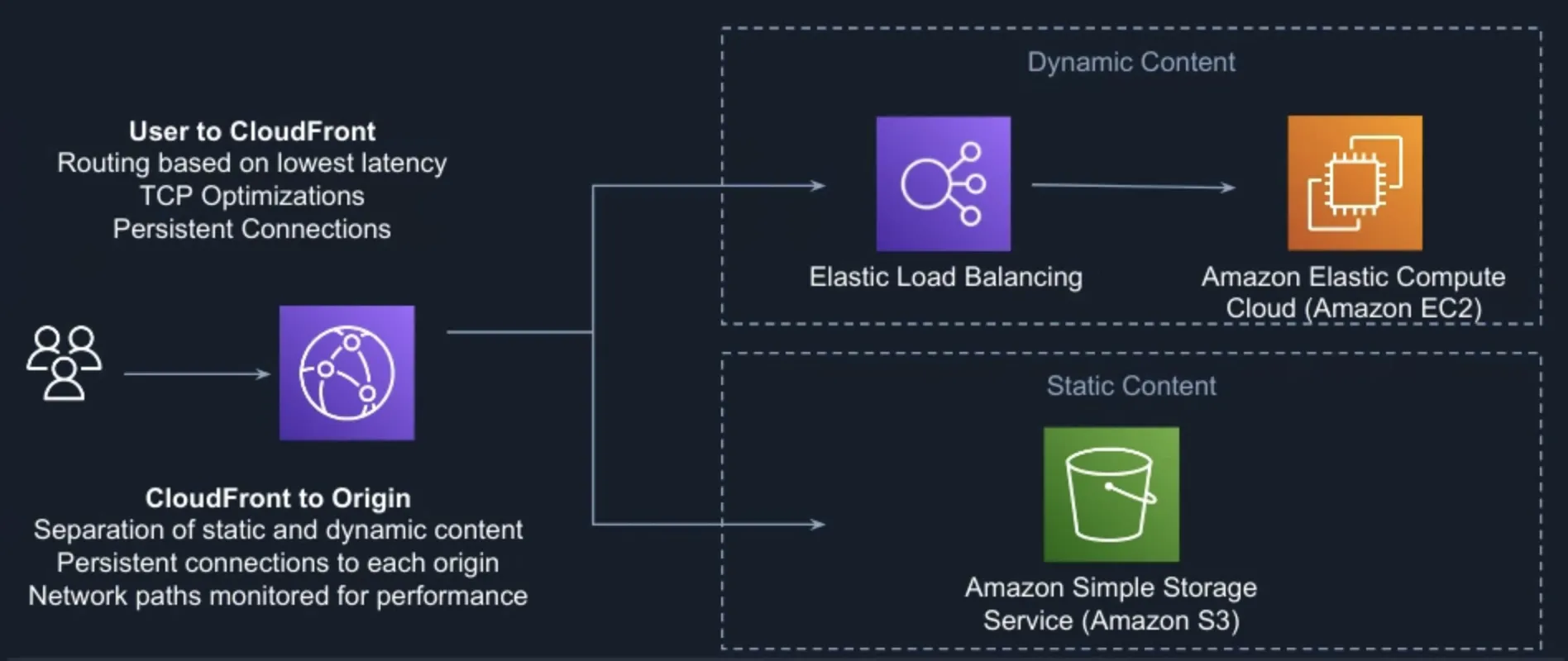For dynamic content acceleration, you can use standard cache control headers you set on your files to identify static and dynamic content. Dynamic content is not cacheable, it proxied by CDN to the origin and back. Faster response time = Reduced DNS Time (Route 53) + Reduced Connection Time (Keep-Alive Connections & SSL Termination)+ Reduced First Byte Time (Keep-Alive Connections)+ Reduced Content Download Time (TCP/IP Optimization). It can further optimise using Latency-based Routing (LBR), run multiple stacks of the application in different Amazon EC2 regions around the world, create LBR records for each location and tag the location with geo information. Route 53 will route end users to the endpoint that provides the lowest latency.
