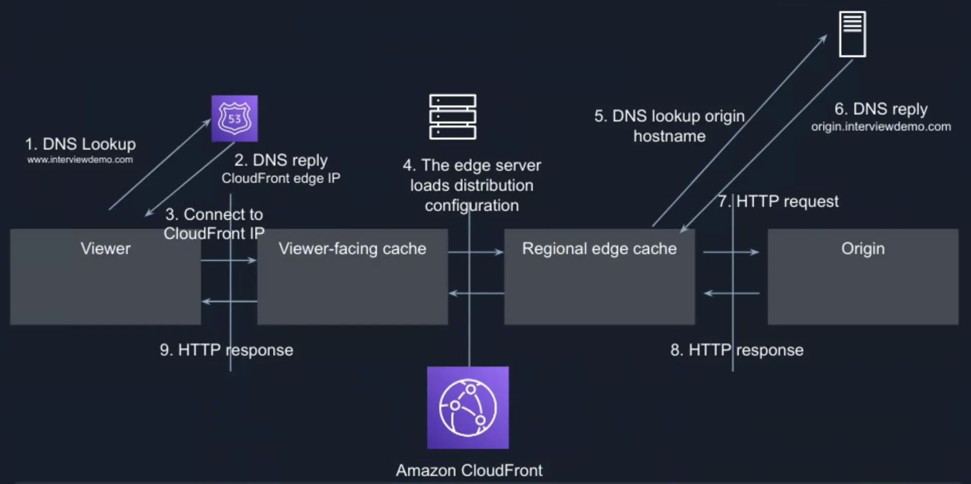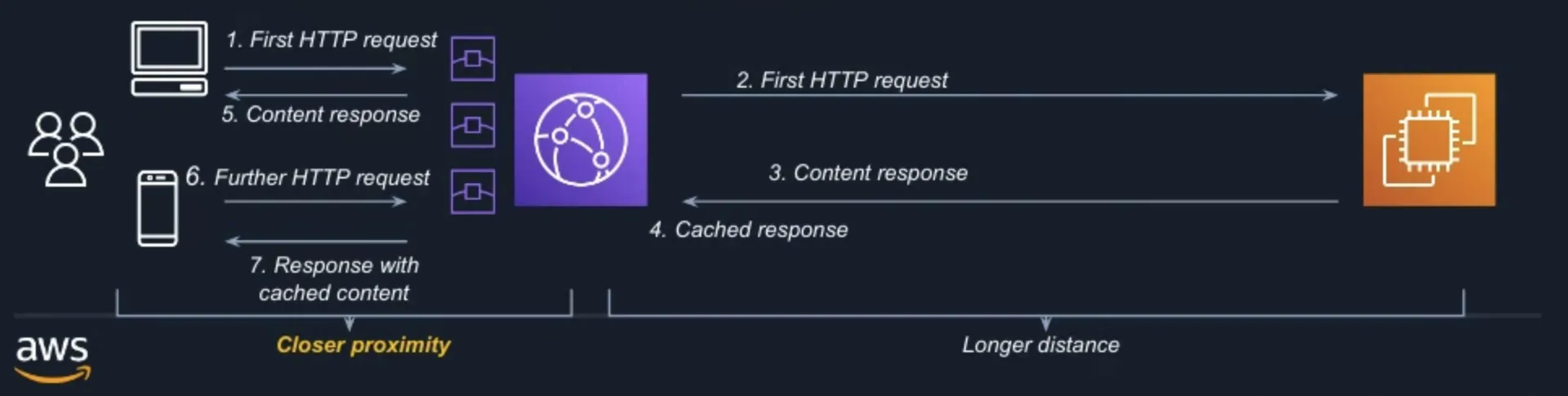 Amazon CloudFront is a content delivery network (CDN) service built for high performance, security, and developer convenience. It speeds up the distribution of your web content to your users, through a worldwide network of data centres called edge locations. The user request is routed to the edge location that provides the lowest latency (time delay), so that content is delivered with the best possible performance. For example, the first client sends a request in the United States, and then needs to cross half the world to Singapore to get the content, but for the second request, it is good to get the previous cache file in the data centre near the United States, which greatly reduces the distance and feedback time.