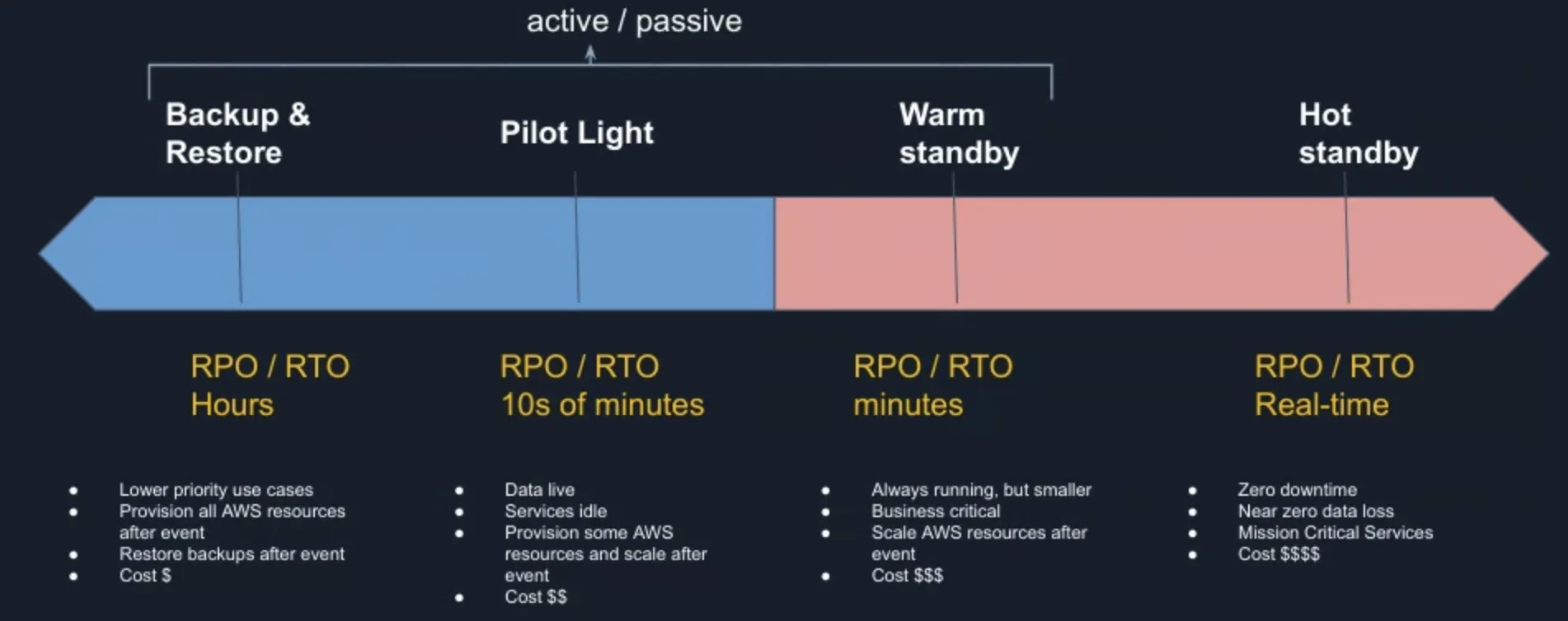 As for the different methods, different costs would be charged. The higher the cost, the faster the recovery. If your business can tolerate a few hours of service interruption, a normal backup and restore scenario is fine. But if it doesn’t work, and it takes a few minutes to restore service, then it’s a matter of replicating an identical environment in a different region, and in a standby state.