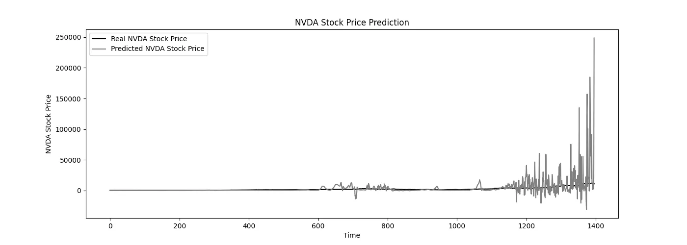 The following plot shows the predicted Nvidia stock prices (gray line) against the actual stock prices (black line), demonstrating the model’s accuracy.