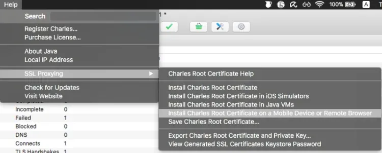 從https://www.charlesproxy.com/download/下載並安裝Charles到你的筆記本電腦。安裝後,點擊”在移動設備或遠程瀏覽器上安裝Charles Root憑證”。