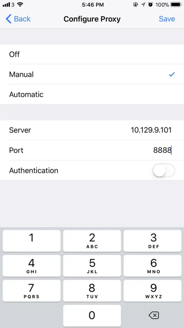 將你的iPhone連接到與你的筆記本電腦相同的Wi-Fi網絡。在iPhone的Wi-Fi設置中,導航到HTTP代理,並選擇”配置代理”,輸入手動細節。