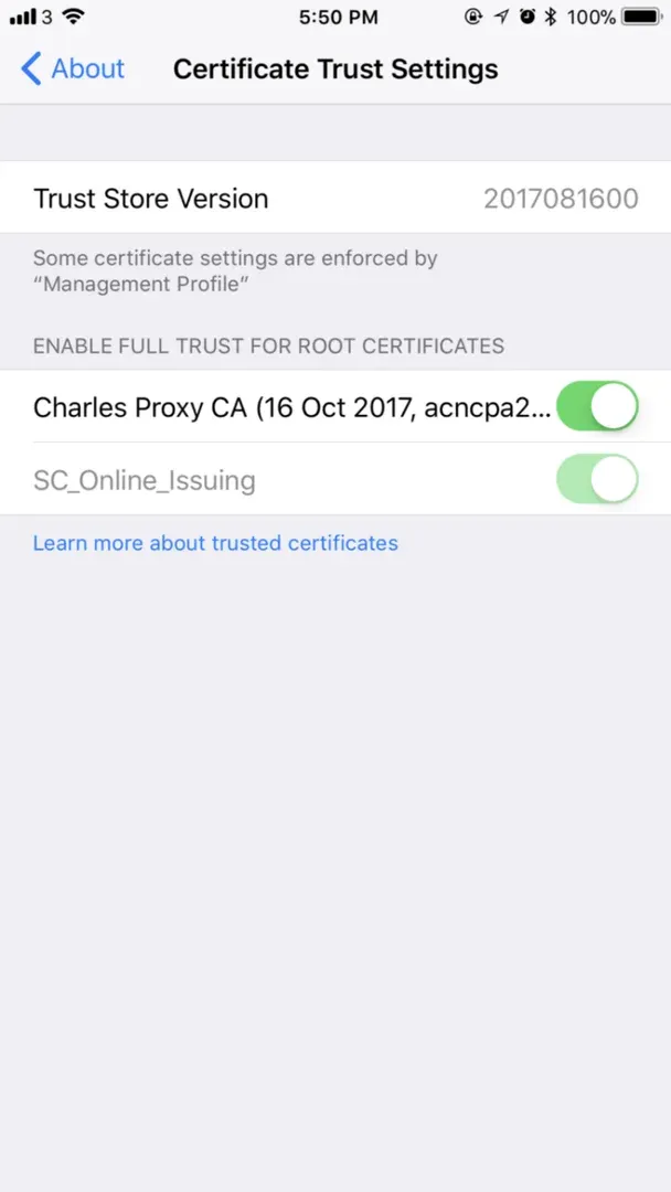 在你的iPhone上,前往設置 > 一般 > 關於 > 證書信任設定,並將”Charles Proxy CA”切換到”開啟”。